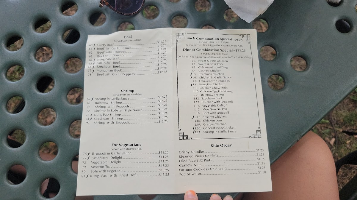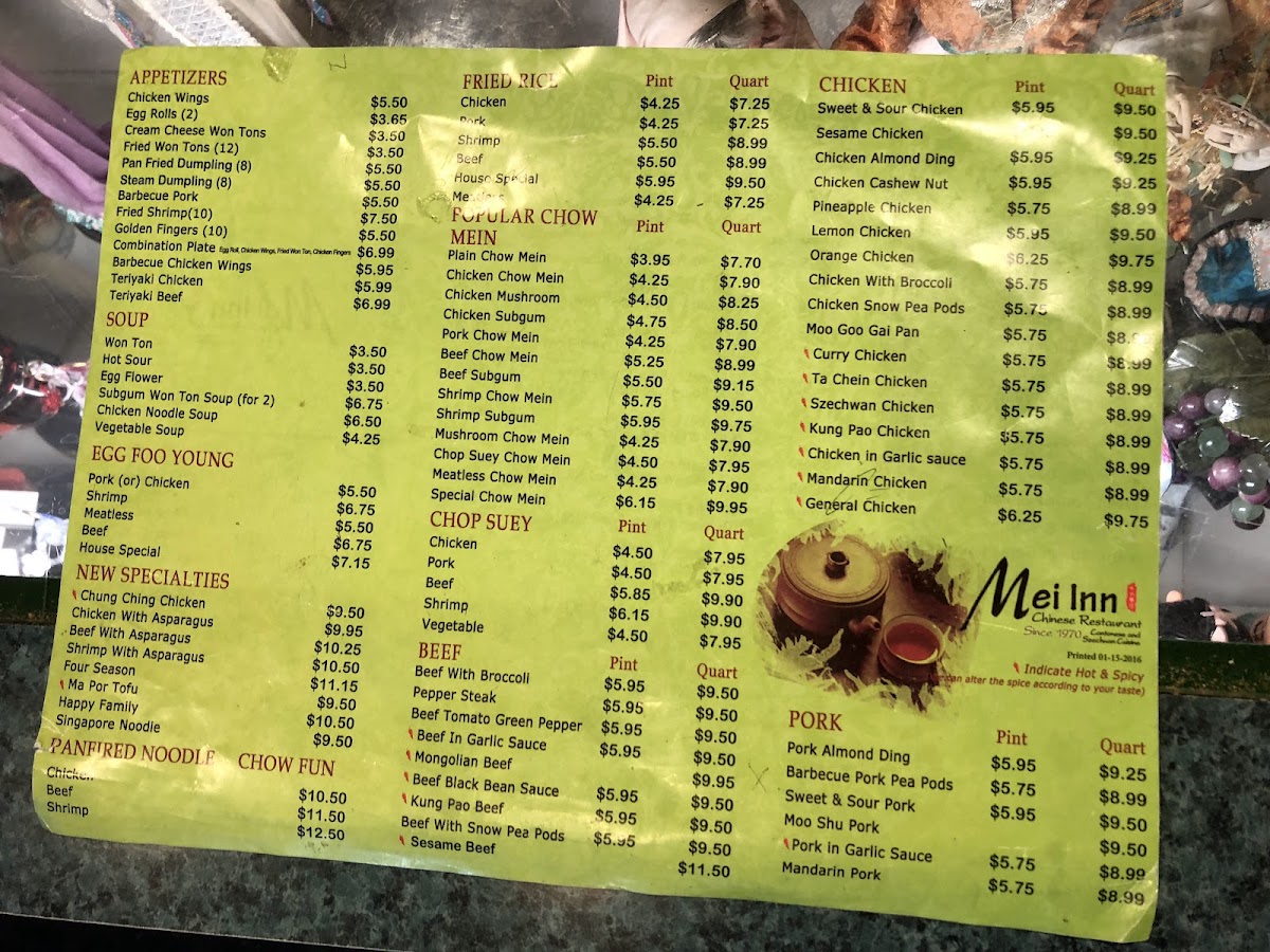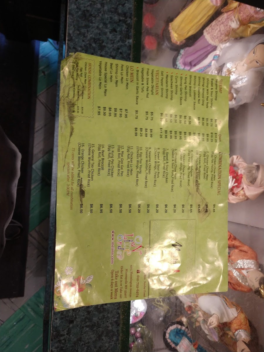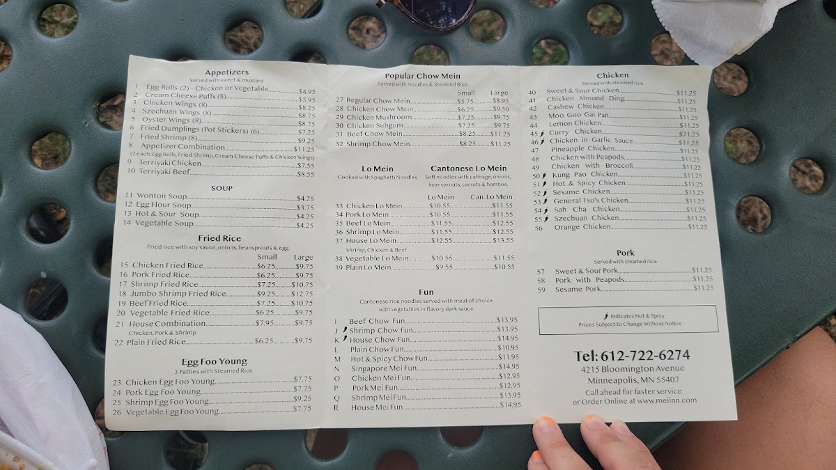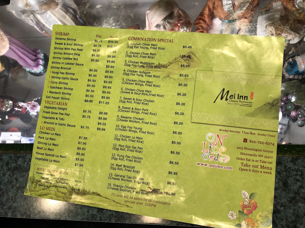 Mei Inn at 4215 Bloomington Ave in Minneapolis keeps its menu refreshingly classic and easy to navigate, with a wide spread of familiar Chinese-American favorites plus a few Thai-leaning comforts. If you like dependable poultry dishes, the Chicken section covers everything from Cashew Chicken and Szechuan Chicken to lighter plates like Chicken With Peapods and Moo Goo Gai Pan, alongside crowd-pleasers such as Sweet & Sour Chicken. Pork lovers can rotate between Pork With Peapods, Sesame Pork, Ma Po Tofu, and Sweet & Sour Pork, while shrimp fans have plenty of punchy options like Szechuan Shrimp, Rainbow Shrimp, Shrimp With Broccoli, Shrimp In Garlic Sauce, and Kung Pao Shrimp. Noodle choices are solid too-Popular Chow Mein includes Chicken Mushroom, Shrimp Chow Mein, Chicken Chow Mein, Regular Chow Mein, and Chicken Subgum, and there’s even more variety with Plain Chow Fun, Pork Mei Fun, Chicken Mei Fun, Hot & Spicy Chow Fun, and Singapore Mei Fun. For Lo Mein, you can keep it simple or go hearty with Shrimp Lo Mein, House Lo Mein, Pork Lo Mein, Vegetable Lo Mein, or Beef Lo Mein. Starters like Cream Cheese Puffs (8), Szechuan Wings (6 Pieces), Oyster Wings (6 Pieces), Pork Fried Dumplings/ Pot Stickers (6 Pieces), and Fried Shrimp (8) set the tone, and soups-Hot & Sour Soup, Vegetable Soup, Wonton Soup, and Egg Flour Soup-round things out nicely. Vegetarians aren’t an afterthought, with Szechuan Delight, Kung Pao With Fried Tofu, Vegetable Delight, Tofu With Vegetables, and Broccoli In Garlic Sauce. Beef options like Kung Pao Beef, Sah Cha Beef, Mongolian Beef, Szechuan Beef, and Beef With Peapods add depth, and the Thai line is straightforward and filling, including Thai Red Curry With Pork ( Medium Size - 24 Oz), Thai Red Curry With Beef (Medium Size - 24 0z), Thai Red Curry With Tufu ( Medium Size - 24 0z), Thai Red Curry With Chicken ( Medium Size - 24 0z), and Thai Red Curry With Shrimp (Medium Size - 24 0z). For value, the Daily Combination Specials-like C16. Shrimp With Mixed Vegetables (Combo), C1. Sweet & Sour Chicken (Combo), C18. Szechuan Beef (Combo), C14. Orange Chicken (Combo), and C6. Chicken In Garlic Sauce (Combo)-make ordering quick. And if you’re customizing, the extras are practical, especially Extra Egg ($1.00), plus add-ons like Adding/ Extra Beef, Fried Rice (1/2 Pint), Cashew Nuts, and Blanched Broccoli (Quart). Overall, Mei Inn’s menu reads like a reliable neighborhood staple-lots of recognizable staples, plenty of spice-forward choices, and enough noodles, tofu, and combo options to keep both groups and solo diners happy.